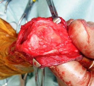 手術写真①では膝蓋骨脱臼の原因である内側膝蓋靱帯が断裂している様子です。